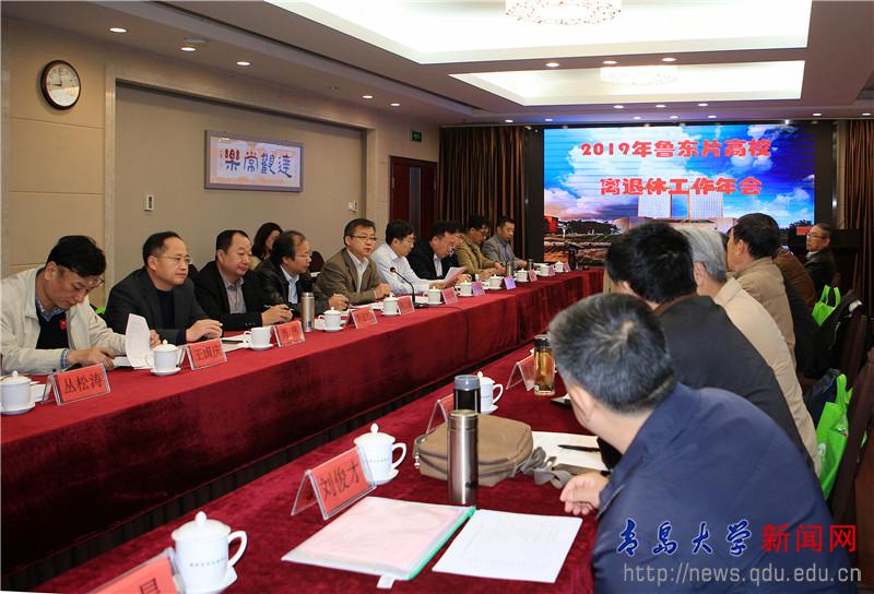 校党委常委、副校长肖江南在会上致辞,并介绍了我校办学、教学科研、学科建设及离退休工作等方面所取得成效。鲁东片区的八所高校离退休工作负责人分别就2019年工作的特色、亮点进行了交流。省直老干部工作联络员李延良、胡世伟、省教育厅老干处处长刘俊才分别做了讲话。省委老干部局政策协调处处长杨德峰做总结讲话,他首先就各高校2019年工作给予了充分肯定,认为鲁东片区高校离退休工作转型发展有成果,老同志精神面貌昂扬向上,各项工作走在了全省同行的前列。让老同志们找到了退休后的人生价值和存在感,为党的事业和学校的发展增添正能量,并起到了示范引领作用。离退休工作团队的奉献与创新得到了上级领导认可。